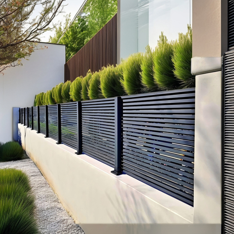 แผงรั้วอลูมิเนียมสีเทาดำแบบกึ่งส่วนตัวติดตั้งง่ายหน้าจอแนวนอน50ม. สำหรับลานในบ้านโมเดล3D ยอดนิยม